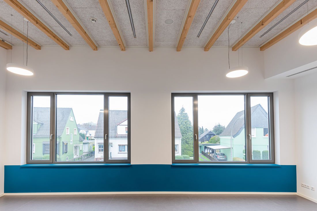 Im Gebäudeinneren wird durch ein stimmiges Farbkonzept die Orientierung der Schülerinnen und Schüler im Gebäude erleichtert. Abgestufte Farbtöne in Blau und Grün kombiniert mit dunkelgrauen Linoleumböden schaffen ein gleichermaßen zum Spielen und Lernen anregendes Ambiente.